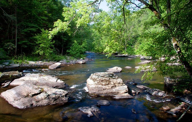 Famous for its clarity, the Tellico River often appears glass-clear with hints of blue and green. From roadside pull-offs, you can easily see rocks, fish, and ripples far below the surface. The river cuts through the Cherokee National Forest, where the dense canopy and clean watershed keep the water pristine year-round.