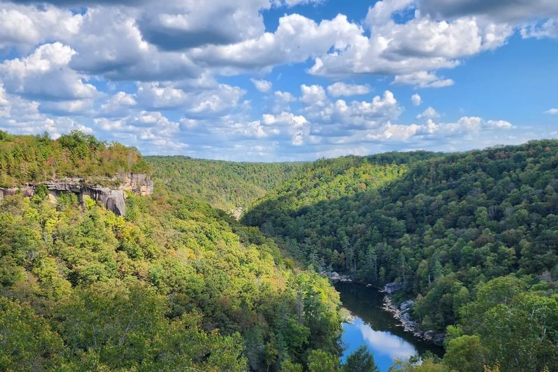 Locals proudly call this the “Grand Canyon of Tennessee,” and once you see it, you’ll understand why. The Tennessee River makes a sweeping bend here, carving through ancient rock and creating cliffs that tower over the water below. Dense forests blanket the slopes, turning brilliant shades of red and gold each autumn.